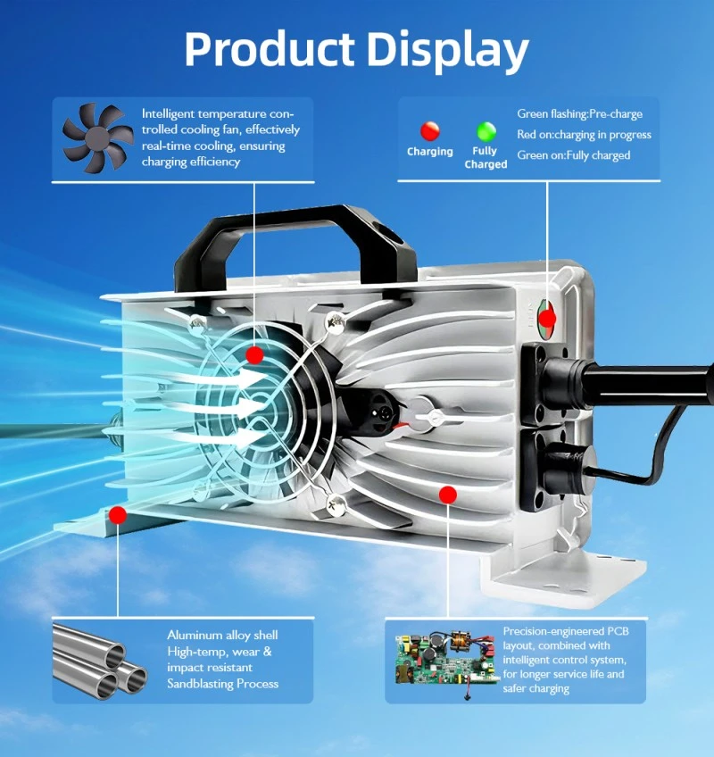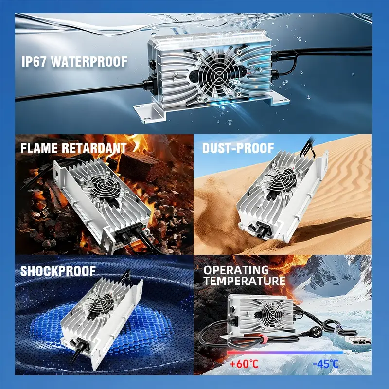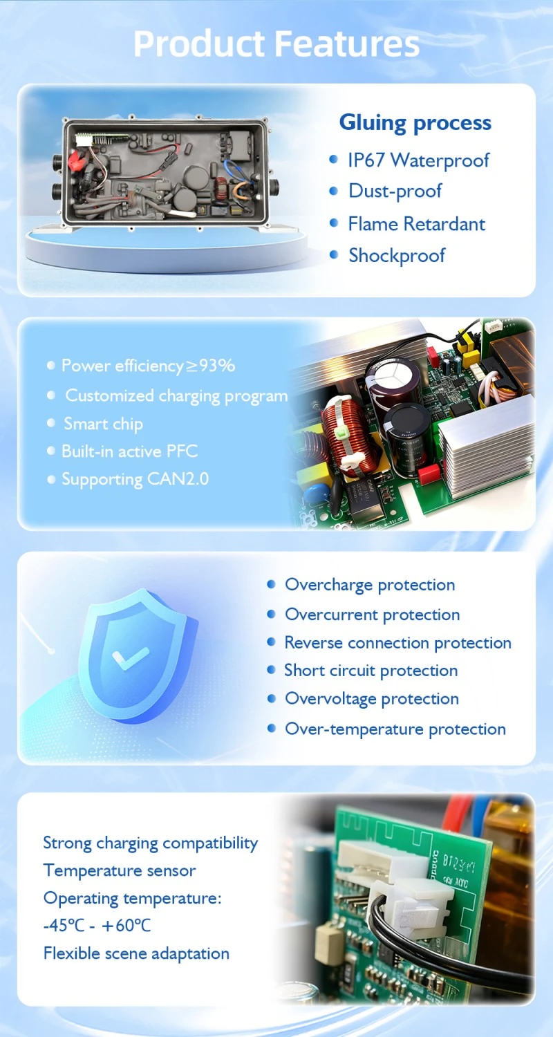 フルアルミニウム合金シェルは、プラスチックシェルと比較して放熱効率を 35% 高め、1.2kW の連続動作中の充電器の動作温度を 60℃ 以下に保ち、内部コンポーネントを保護し、耐用年数を延ばします。さらに、過電圧保護(最大55V)、過電流保護(最大28A)、短絡保護、過熱保護などの多層安全保護機構を備えており、充電器とバッテリーの損傷を効果的に防止し、あらゆる車載環境での安全な動作を保証します。