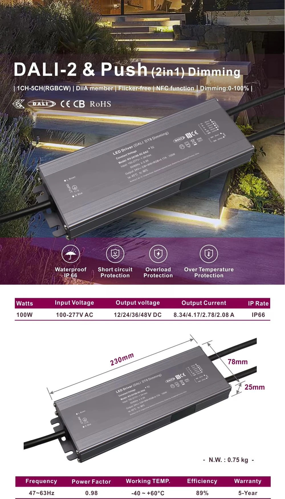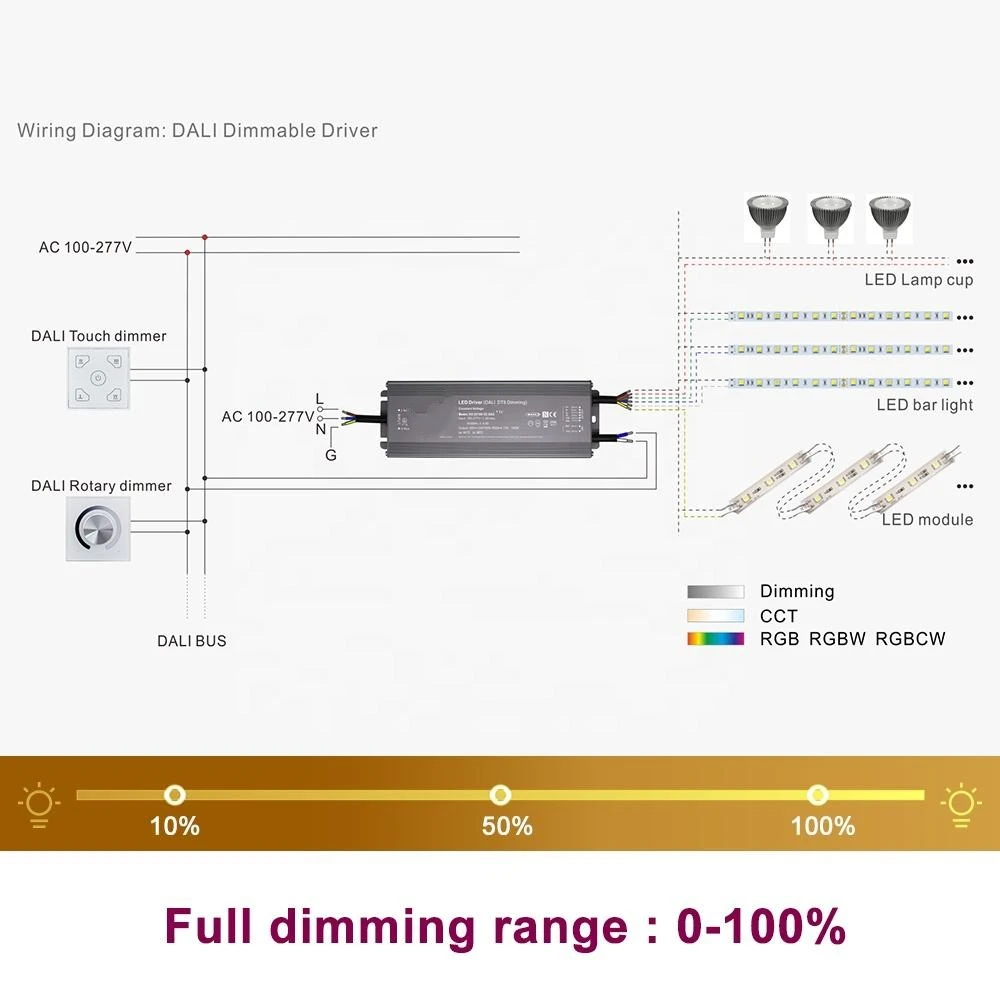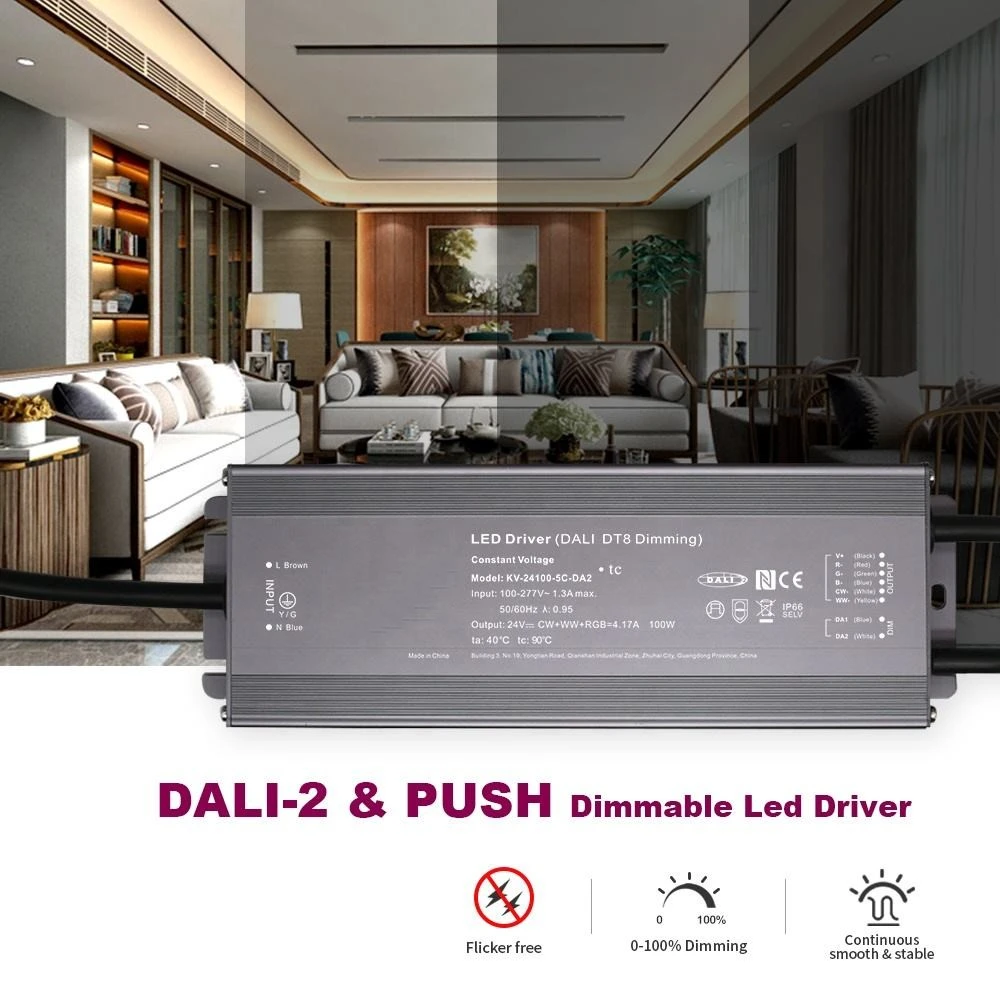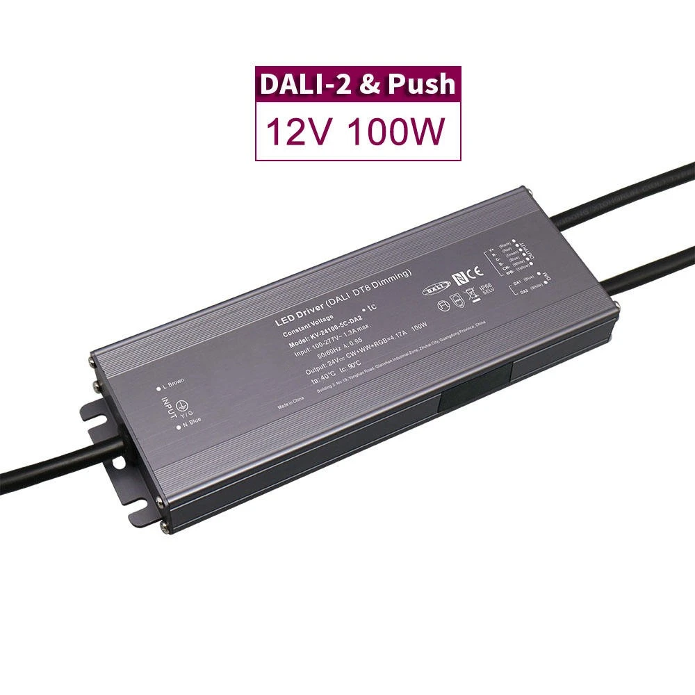 中国のプロの LED ドライバー メーカーである Starwell のこの 100W DALI 定電圧 CCT 調光 LED ドライバーは DALI-2 認定を受けており、シームレスな光制御のために 0.1% ~ 100% の正確なデジタル調光を提供します。自由空気対流による受動的冷却による、短絡、過負荷、過熱に対する重要な保護機能が含まれています。