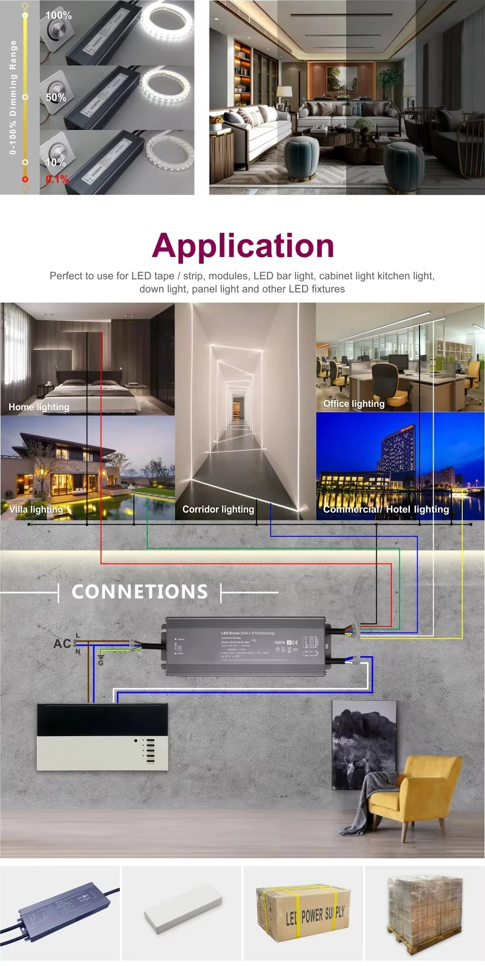 あらゆる環境に対する比類のない耐久性 私たちはレジリエンスを目指して構築します。耐久性のある防水 IP66 DALI-2 DT8 CCT 調光可能な LED ドライバーは、頑丈な保護シェルと効果的なヒートシンクの両方として機能する、洗練された直線的なフルアルミニウム ハウジングを備えています。この設計により、自由空気対流による効率的な冷却が可能になり、安定したパフォーマンスが保証されます。短絡、過負荷、過熱に対して厳密に保護されています。重要なのは、IP66 防水評価 (EU) を誇り、完全に防塵で強力な噴流から保護されており、乾燥した場所、湿気の多い場所、および湿った場所 (米国) に対して認定されています。この二重性により、屋内の建築物や商業スペースから、難しい屋外の看板やファサードの照明に至るまで、幅広い用途に最適な選択肢となります。