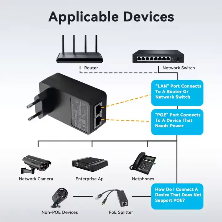 12W POE アダプター交換可能プラグ POE インジェクターは、さまざまなネットワークおよびセキュリティ環境で広く使用されています。
