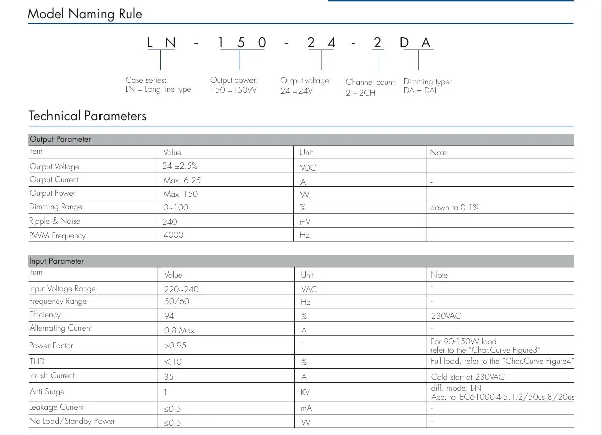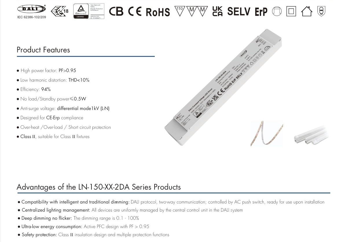 二重絶縁: 150W 24V DALI CCT 定電圧 LED ドライバーは基本絶縁と追加絶縁で構成され、2 つの独立した絶縁保護層を形成します。1 つの層が故障した場合でも、もう 1 つの層で感電を防止できます。