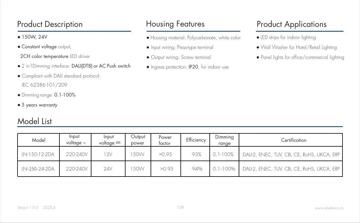 Starwell 工場のホットセール 150W 24V DALI CCT 定電圧 LED ドライバーは、独立した DALI CCT デュアル色温度調整をサポートしており、明るさと色温度を正確に制御して、多様な照明ニーズに対応できます。この製品は、91% の高効率、力率 (PF) > 0.95、低高調波歪み (THD) < 10%、超低待機電力消費 (≤ 0.5W) を誇り、CE-Erp エネルギー効率基準を満たしています。