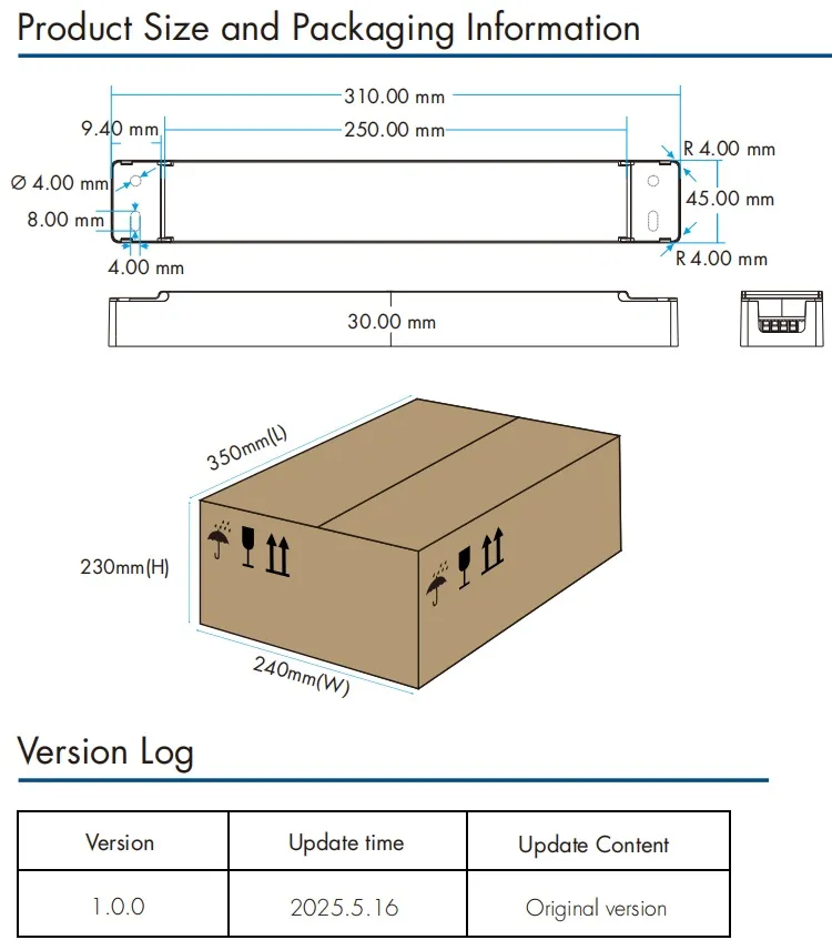 調光インターフェース 0/1-10V 調光: 調光範囲 0-10V または 1-10V、調光コネクタ消費電流 ≤ 0.3 mA、調光曲線は「特性曲線図 6-7」を参照してください。 CCT カーブについては「特性カーブ図 8」を参照してください。 プッシュスイッチ調光:電圧範囲220〜240VAC 50/60Hz。