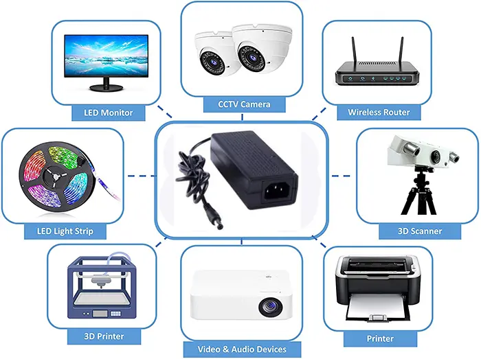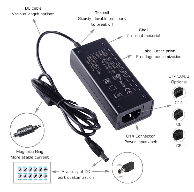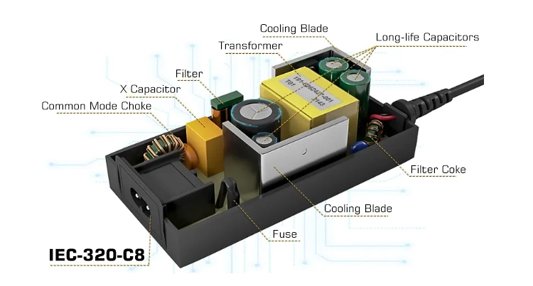 STARWELL 150W デスクトップ電源アダプタは、IEC C6 標準電源入力ポートと 5.5*2.1mm DC 出力コネクタを備えており、高電力デバイス向けのプロフェッショナルな電源ソリューションとして機能します。 150W AC/DC電源アダプタの電圧出力精度は±2%と高く、電力変換効率は90%を超えます。安全性を確保するためにCEおよびFCC認証に合格しました。 STARWELL 電源アダプタは、オフィス、エンターテイメント、商業シナリオ全体でデバイスに電力を供給するのに最適で、元のアダプタの費用対効果の高い代替品として、または複数のデバイスの電源ニーズに対応する拡張品です。