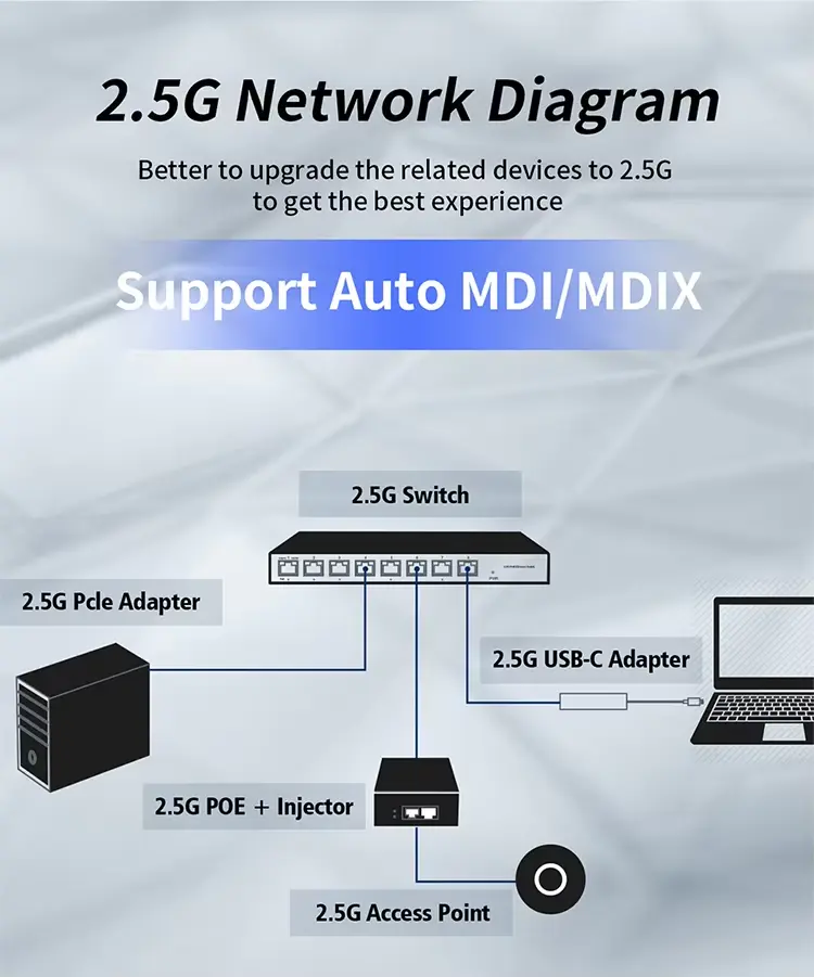 2.5Gbps のデータ速度をサポートし、10/100/1000Mbps デバイスとの完全な下位互換性により、帯域幅の変化を先取りします。