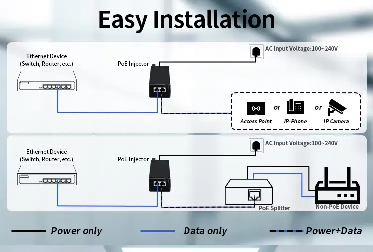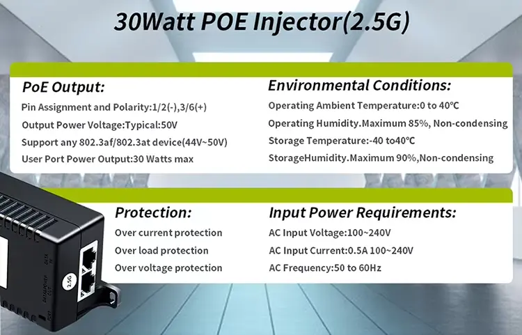 この 30W PoE インジェクタは複数の PoE 規格をサポートしているため、さまざまなデバイスに柔軟に選択できます。