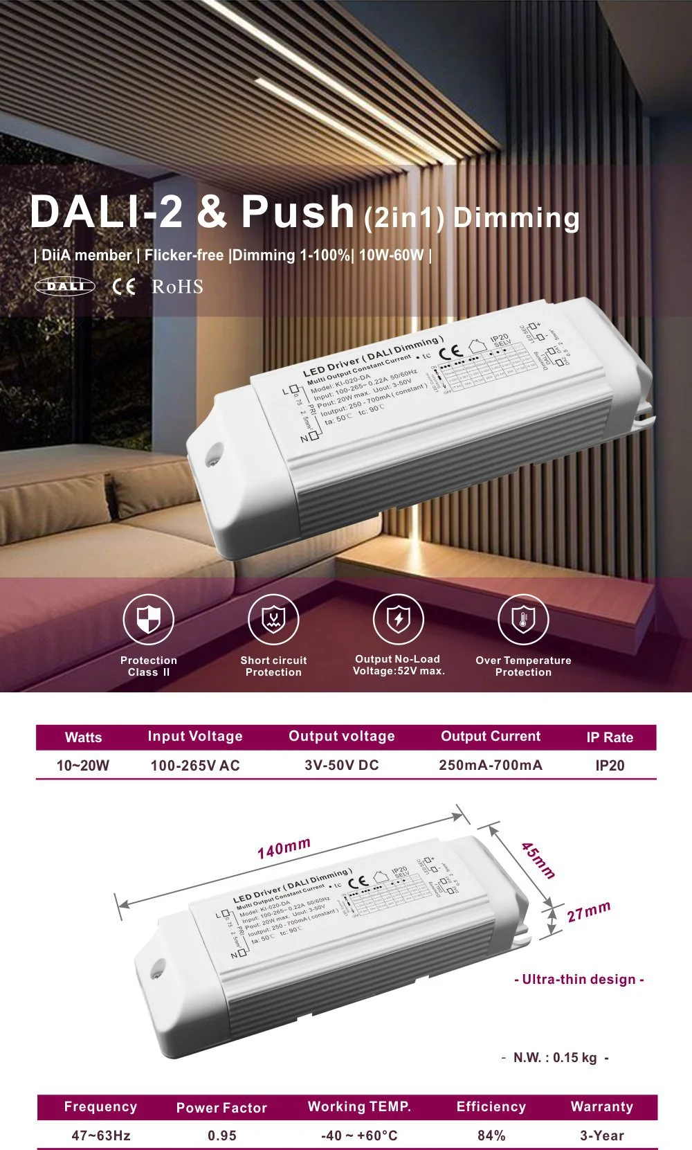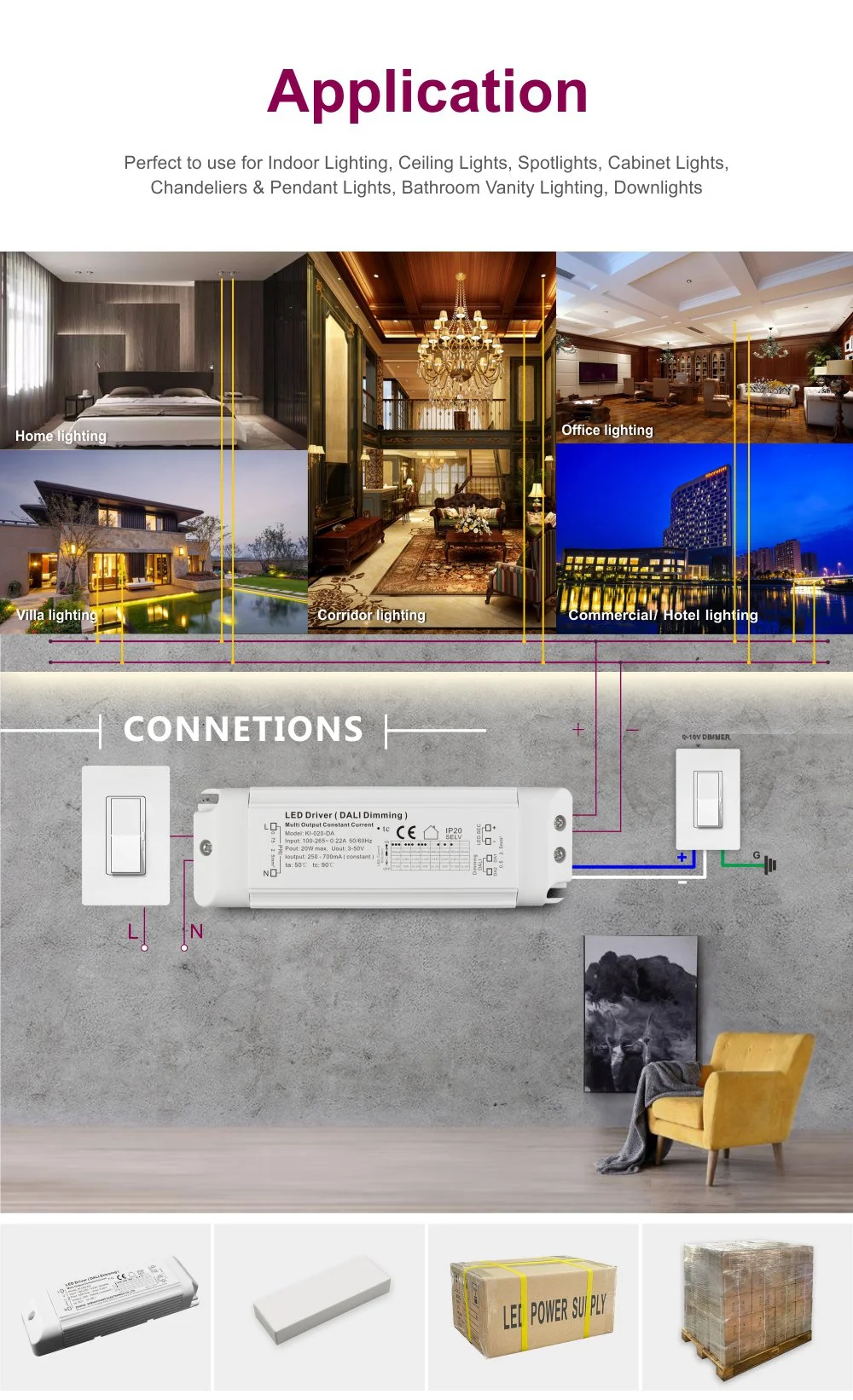 コンパクトな設計により設置と統合が容易になり、包括的な過電圧、過熱、短絡保護を提供します。この製品は、インテリジェントなシーンベースの照明制御が必要な美術館、オフィス、ホテルなどの場所に適しており、効率的な省エネと柔軟な光環境管理を実現するための理想的なドライバーソリューションです。