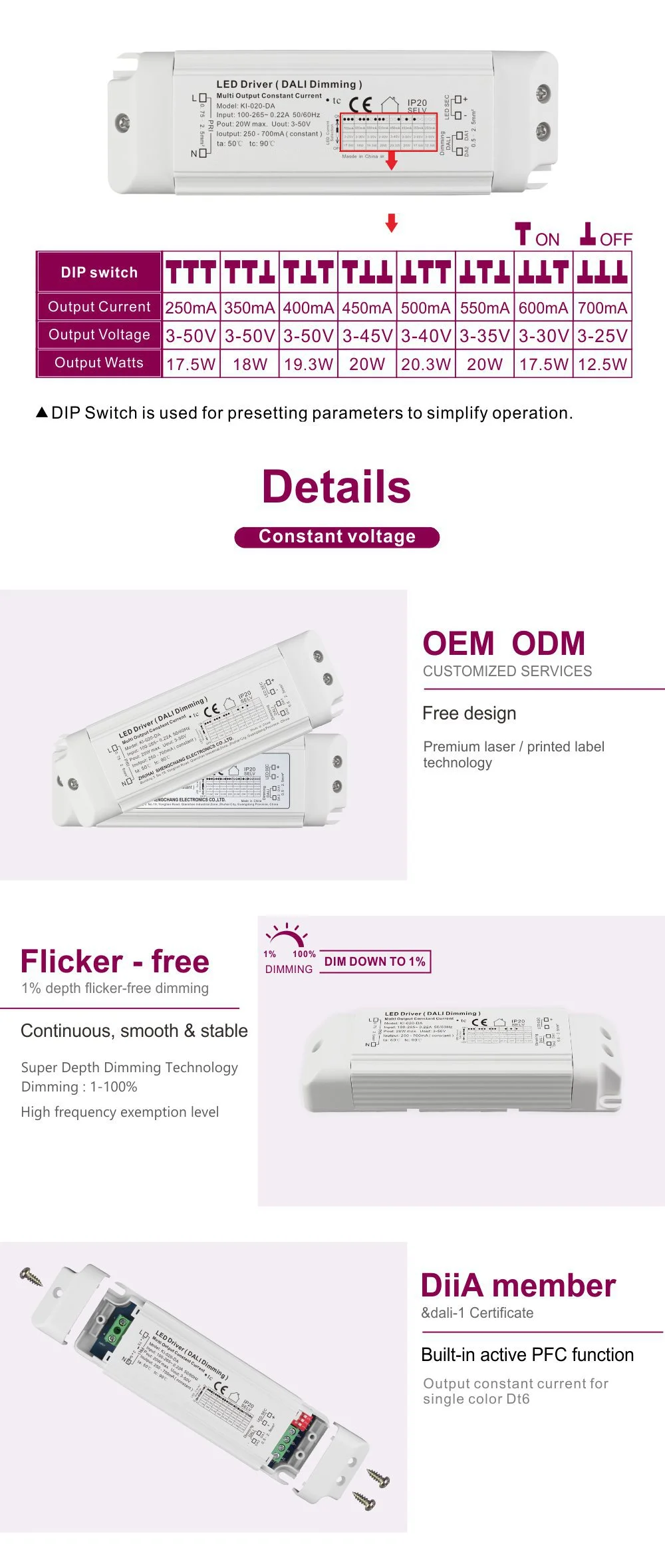 LED ライト用の信頼性の高い 20W Dali 調光定電流電源として、LED モジュールまたはライト ストリップに純粋でちらつきのない定電流を確実に提供します。製品筐体には、放熱性に優れたコンパクトで堅牢な構造を特徴とするLED照明用調光対応20W LEDドライバAC-DC定電流プラスチックケースを採用し、内蔵・外付けの両方に対応しています。