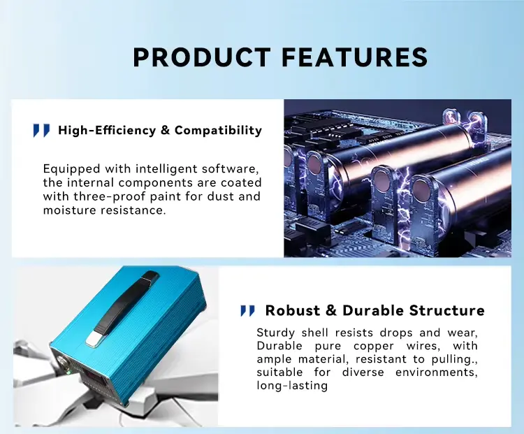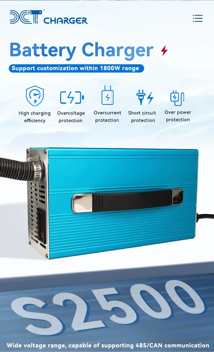 頑丈でコンパクトな構造と優れた放熱性を備えており、電気自動車、産業用洗浄機、エネルギー貯蔵システム、AGV、海洋機器に適しています。国際的な安全認証に準拠しており、カスタマイズされたコネクタとラベルをサポートしています。高効率、安定性、耐久性を兼ね備えたこの充電器は、中~大容量の 24V バッテリー システムに最適です。