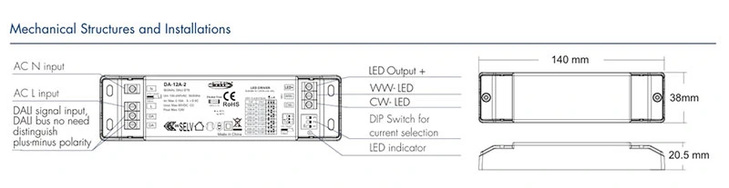 この 30W 定電圧 DALI CCT 調光可能 LED ドライバーは、DALI-2 DT8 プロトコルに準拠し、0.1% ~ 100% の非常に滑らかなちらつきのない CCT 調光と 1 アドレス デュアル チャネル制御をサポートします。シーンプログラミングとグループ制御のためにすべての主流のDALIマスターコントローラーとシームレスにペアリングし、プロのスマート照明の正確な規制要求を完全に満たします。