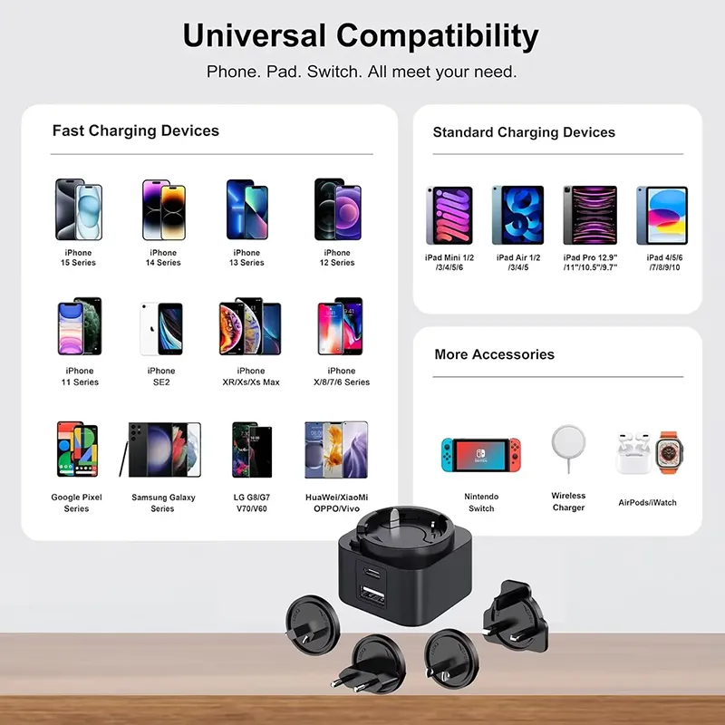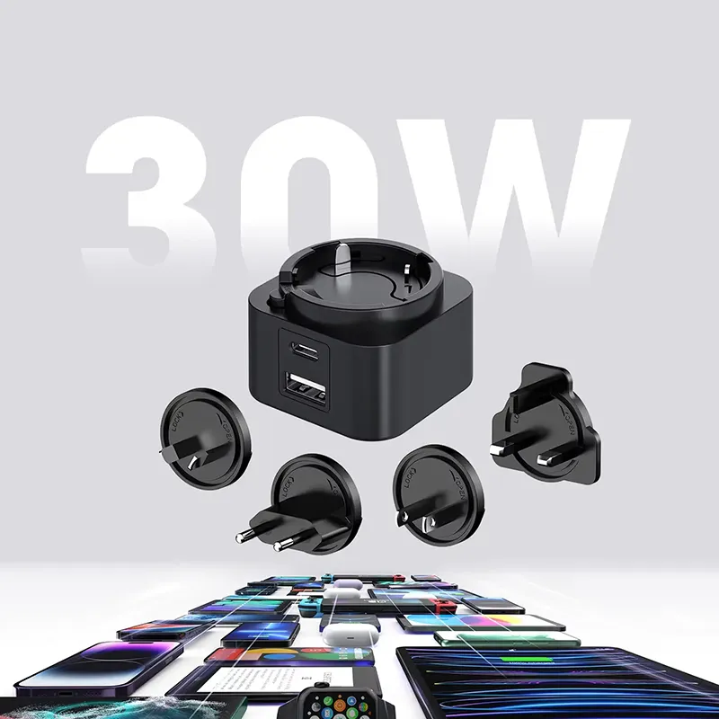 多用途性が鍵となります。デュアルポート設計 (USB-C/USB-A) により、2 台のデバイスを同時に充電できます。 30W 交換可能なプラグ PD 充電器は、交換可能なプラグ (US/EU/UK/AU) のセットを備えており、世界中の旅行に最適です。スマートフォン、タブレット、ラップトップのいずれを充電する場合でも、ユニバーサルな互換性により最高レベルのパフォーマンスが保証されます。