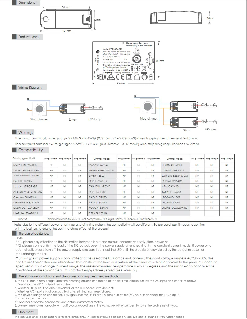 高品質のPE294R 42V最大200maの定電流トライアック調光LEDドライバーは、中国のメーカーStarwellによって開発された定電流調光LEDダイバーの1つで、高力率、高効率、高精度、高性能コンポーネント上の効率的で安定した低損失スイッチ制御チップの使用により、低ノイズ、長寿命およびその他の特性を備えています。