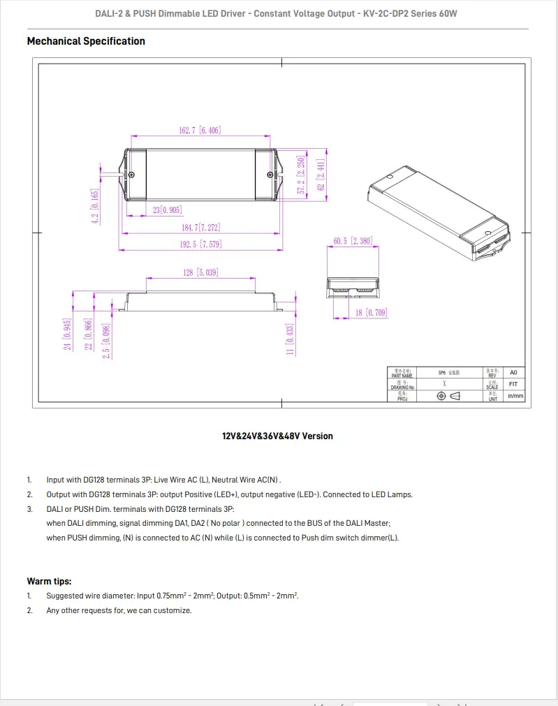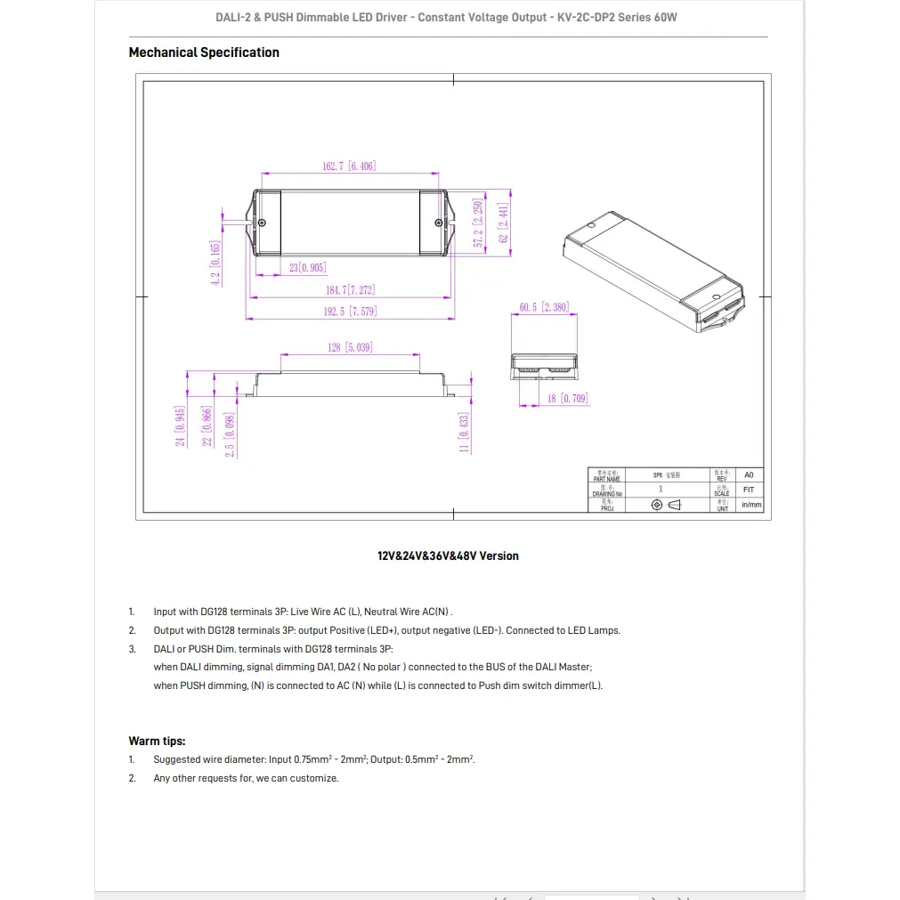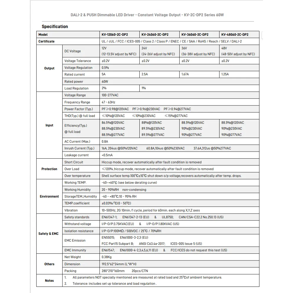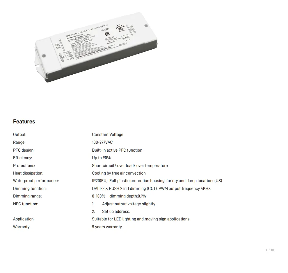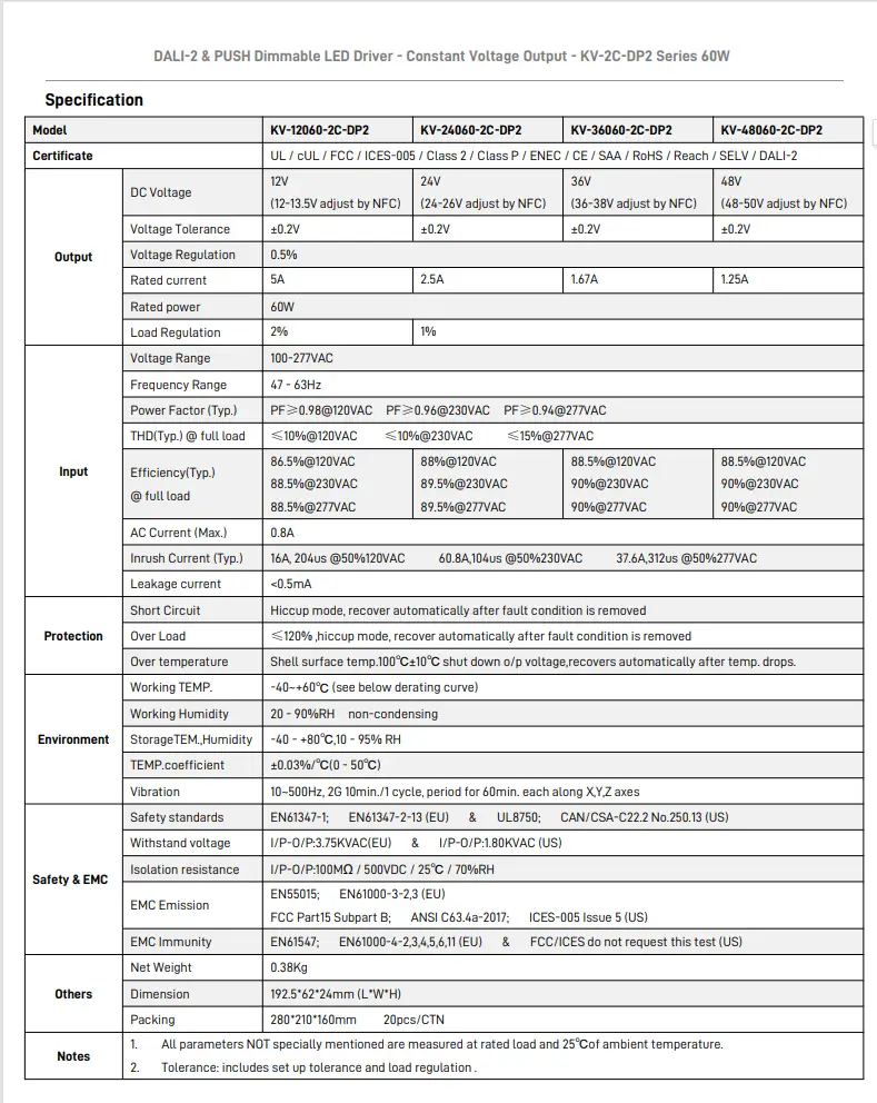 調光機能: DALI-2 & PUSH 2 in 1 調光 (CCT)。 PWM出力周波数4KHz。