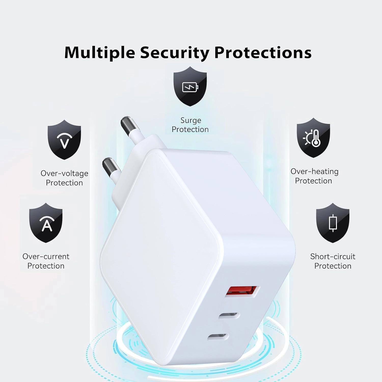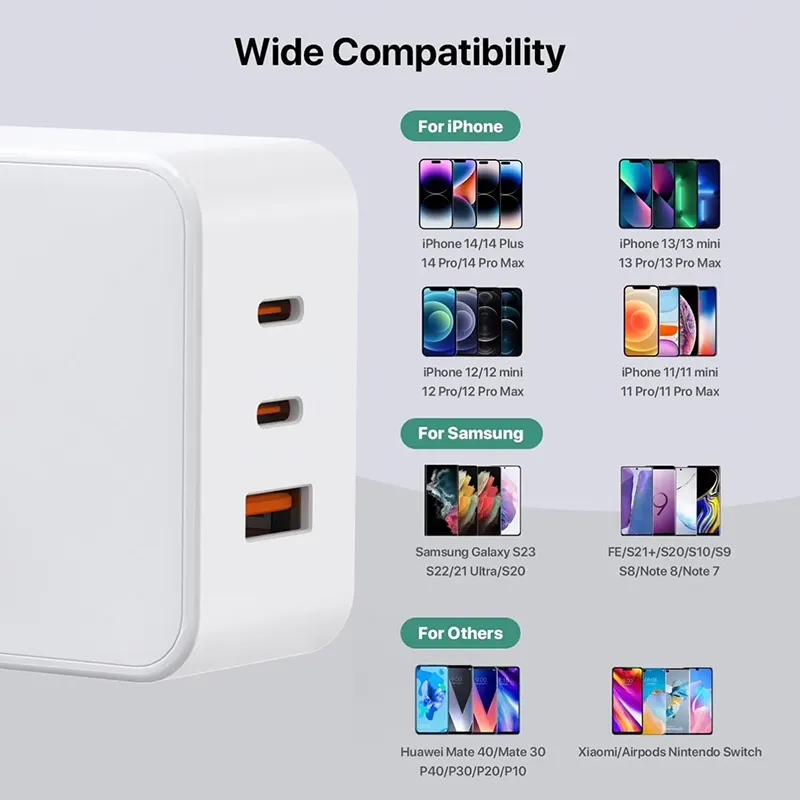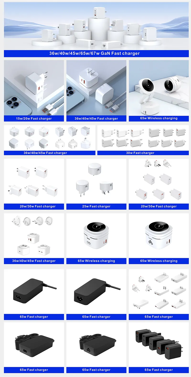 この充電器は最大 65 W の安定した電力を供給し、ラップトップ (例: MacBook Air/Pro、Dell XPS)、タブレット、スマートフォン (iPhone、Samsung Galaxy)、および PD プロトコルをサポートするその他のデバイスを効率的に充電します。コンパクトで軽量なデザインは旅行に最適で、内蔵の過電圧、過電流、短絡保護機能により、充電器と接続されたデバイスの安全な充電が保証されます。通常は 1 ~ 2 個の USB-C インターフェイスが装備されており、複数の小型デバイスの同時充電をサポートし、電力と利便性のバランスをとります。