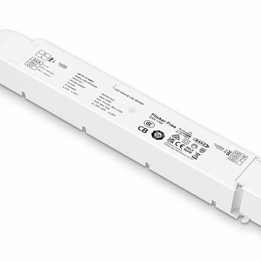 STARWELL 高品質 75W 12V 定電圧 DALI 調光 LED ドライバーは、プロフェッショナル LED 照明システム用に設計された高性能電源です。最大電力 75W の安定した 12V DC 出力を提供し、ストリップライト、看板、装飾照明などの幅広い低電圧 LED アプリケーションで信頼性の高い動作を保証します。 DALI 調光互換性を内蔵した LED ドライバーにより、正確なデジタル制御とスマート照明ネットワークへのシームレスな統合が可能になります。