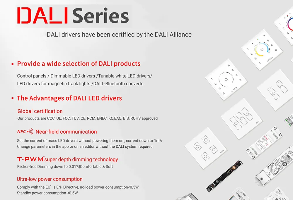 高度な DALI 調光制御 – 高解像度で 0.1% ~ 100% のデジタル調光を可能にし、自動照明システムの個別またはグループ制御用に最大 64 の DALI アドレスをサポートします。