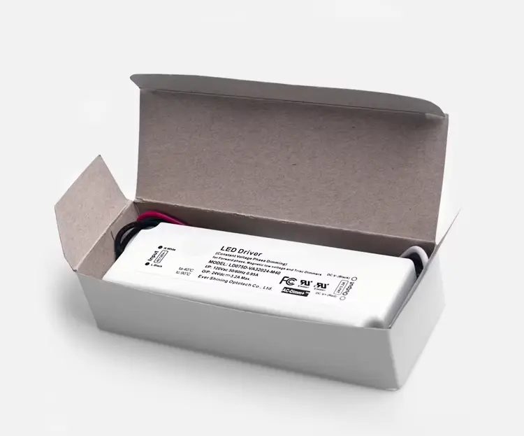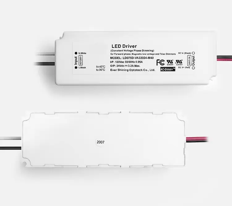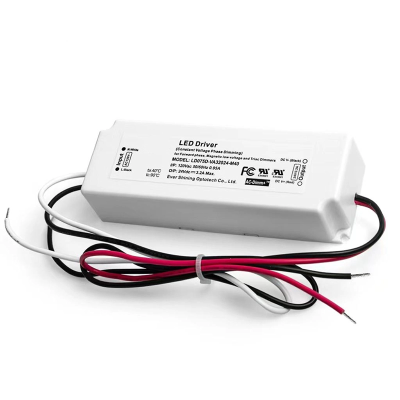 トライアック調光機能付き 75W 定電圧 LED ドライバー • 互換性: ほとんどの標準的なトライアック/白熱式調光器で動作します。 • 安定した出力: 12V または 24V LED システム用の定電圧 (CV)。 • スムーズな制御: フルレンジのちらつきのない調光が可能です。 • 堅牢な保護: 電気的故障に対する安全装置が組み込まれています。 • 一般的な用途: 調光可能な LED ストリップ、モジュール、トラック ライトに最適です。