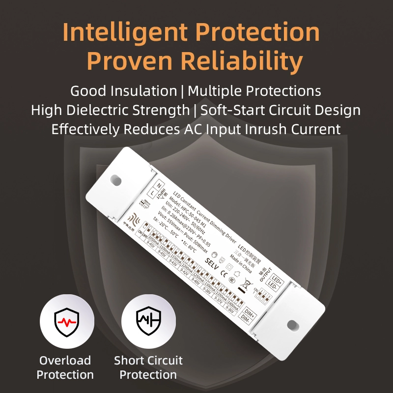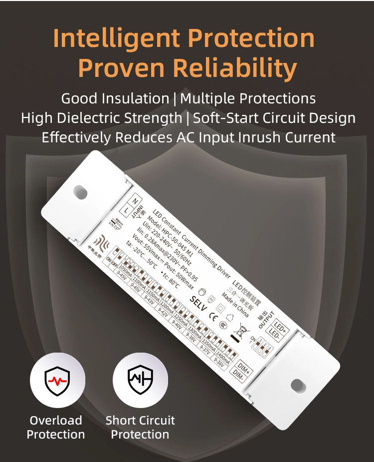 多重保護設計:過電圧(保護閾値≧55V)、過電流(保護閾値≧0.18A)、短絡、過熱(保護温度≧110℃)の4つの保護機構を搭載しています。異常な動作条件が発生した場合には出力を迅速に遮断し、ドライバーとLED光源を損傷から保護します。