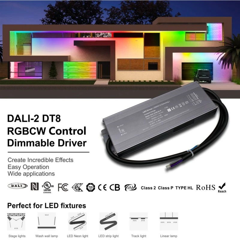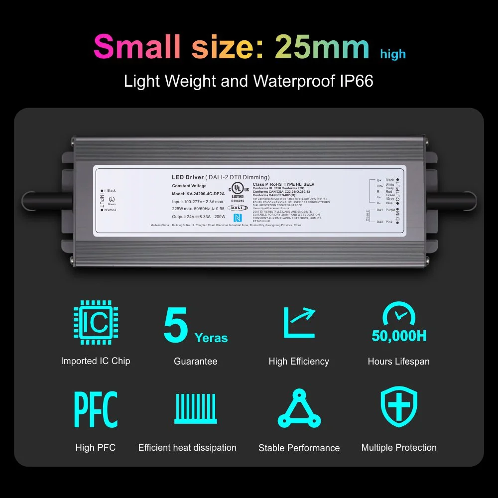 お約束する品質と安心は細部にまで反映されています。厳しい国際安全基準を満たしたUL認証を取得しており、5年間の品質保証が付いています。一言で言えば、これは単なる電源ではありません。これは、強力かつ信頼性が高く、柔軟な照明制御の中核です。この純正の DALI 2 DT8 調光可能 200W LED ドライバーを選択することにより、未来志向のプロ仕様のスマート照明ソリューションを選択することになります。