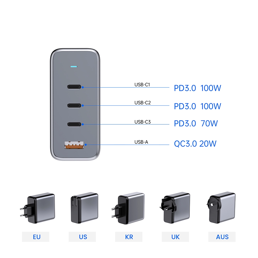 C1/C2出力:5V3A、9V3A、12V3A、15V3A、20V5A、PPS:3.3-20V5A(最大100W) C3出力:5V3A、9V3A、12V3A、15V3A、20V3.5A、(最大70W) PPS:3.3-11V5A USB-A 出力: 5V3A、9V2A、12V1.67A、SCP:3.3-11V2A (最大 22W) C1+C2/C1+C3 出力:70W+30W C1+C2+(C3+USB-A) 出力:40W+40W+15W 合計:100W |