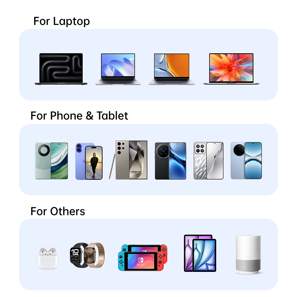 100W の強力な出力: ラップトップのエネルギーステーション 中心となる USB-C1 ポートと C2 ポートはそれぞれ最大 100W のピーク出力をサポートします。この強力な伝送容量は、ほとんどのラップトップの急速充電要件を満たすのに十分です。 MacBook Pro を使用している場合でも、その他の高性能ウルトラブックを使用している場合でも、充電パフォーマンスは純正の充電器と同等か、それ以上です。エネルギーを保ち、創作と生産性に集中し、デバイスの使用中にバッテリー寿命を心配する必要はありません。