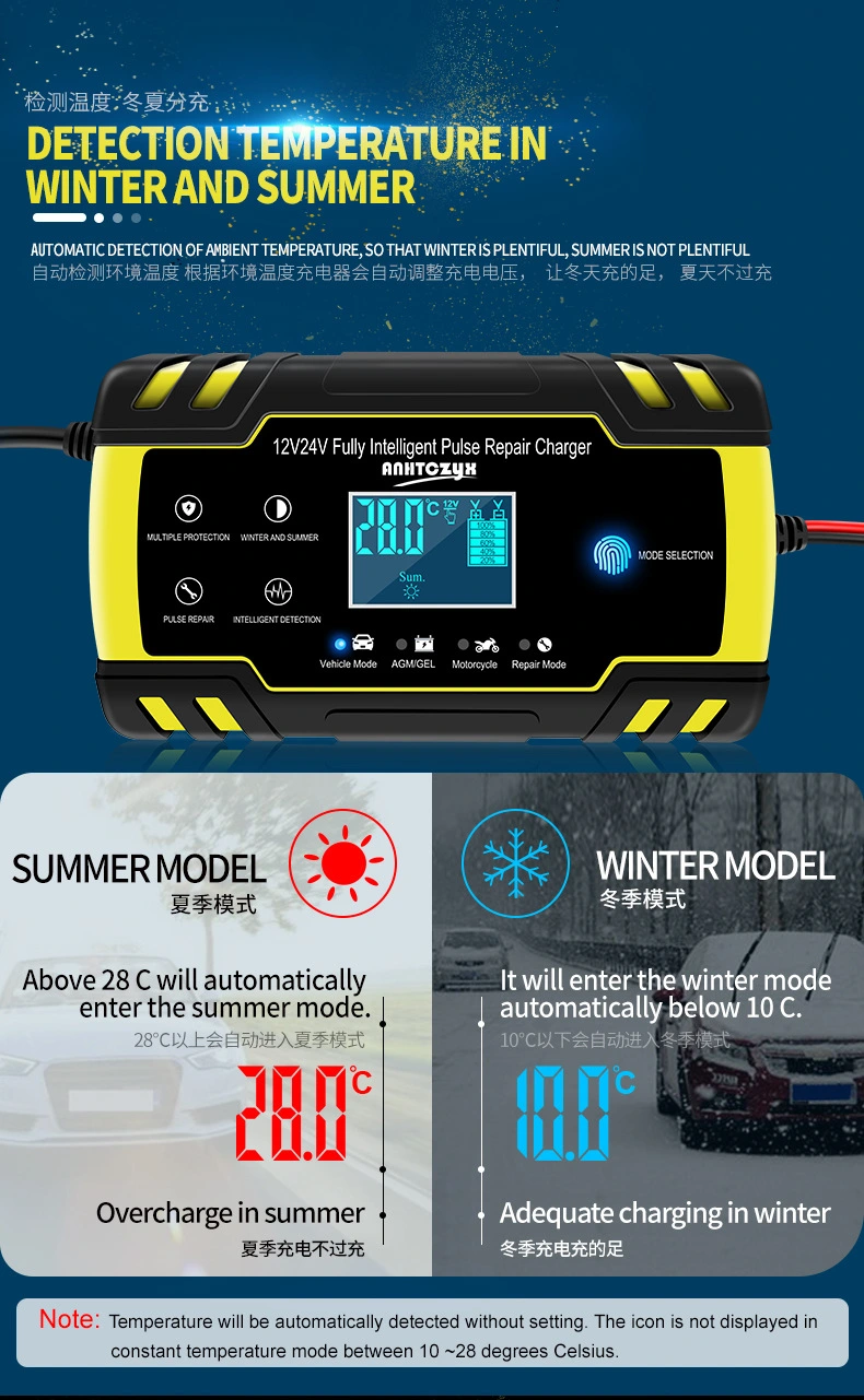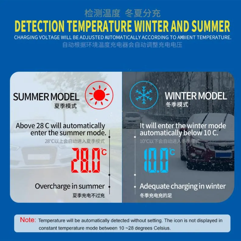 · 自動メンテナンス モード: トリクル充電器および長期バッテリー メンテナンス機能として機能し、季節限定の車両や使用頻度の低い車両に最適です。