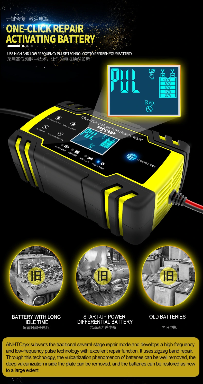 ・パルス修復機能:高周波パルス技術を使用して硫酸鉛の結晶化(サルフェーション)を軽減し、老朽化したバッテリーや充電不足のバッテリーの失われた容量を回復します。