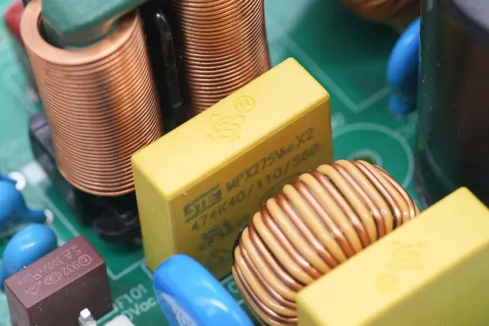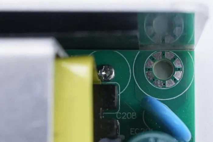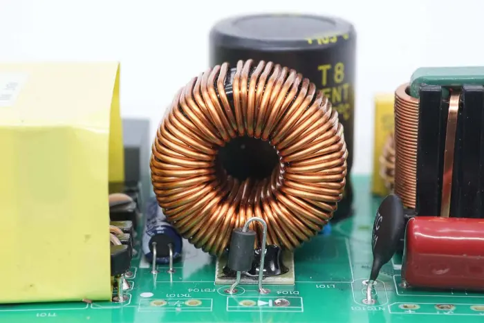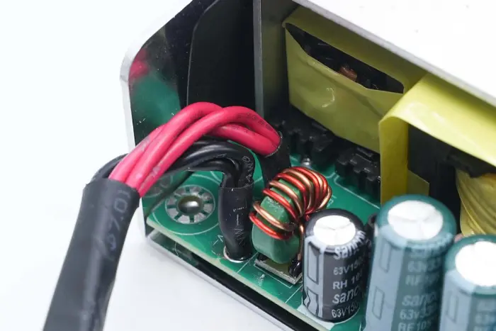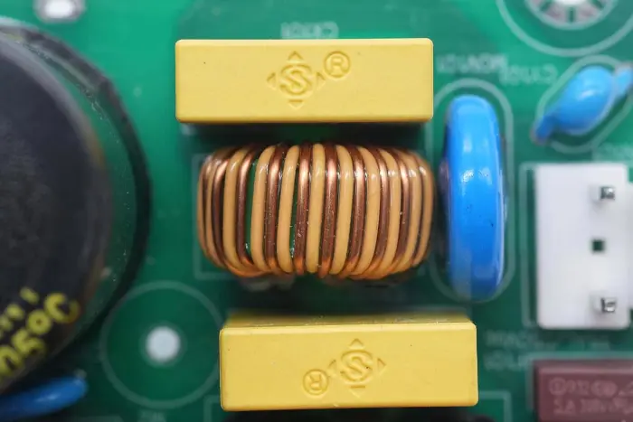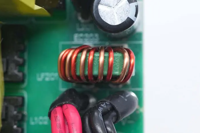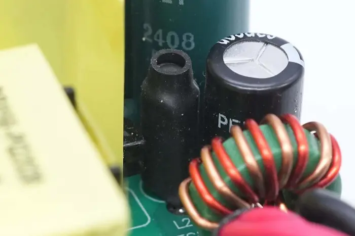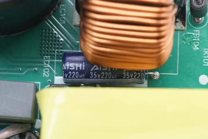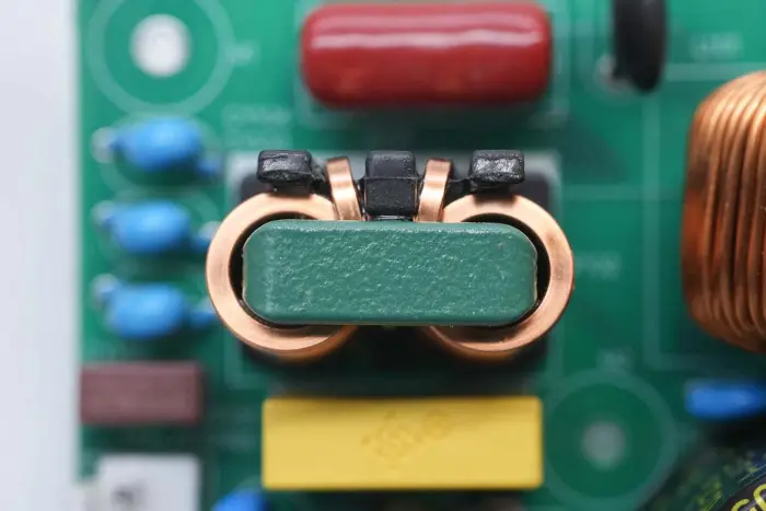 PFCブーストインダクタには磁気リングが巻かれており、底部には絶縁のためベークライトシートが設けられています。