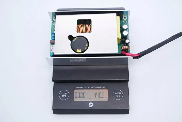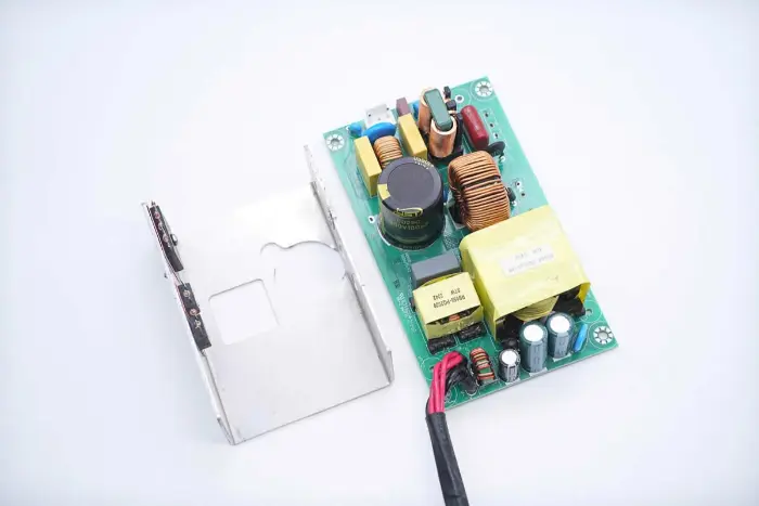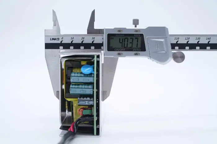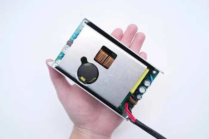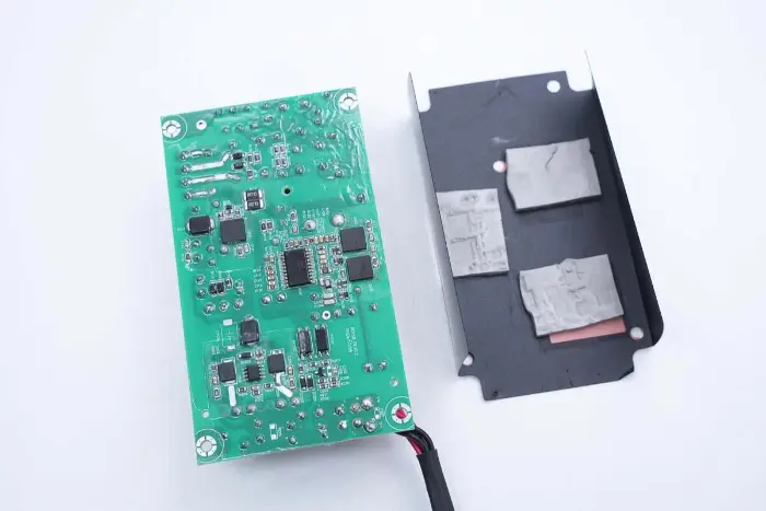 スターウェル 300W GaN電源モジュールはアルミニウム合金シェルを採用しています。 PCBA モジュールの前面にはアルミニウム合金ヒートシンクが装備されており、厚さを減らすために高電圧フィルター コンデンサーと PFC ブースト インダクターに対応する部分がくり抜かれています。