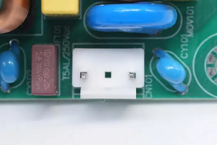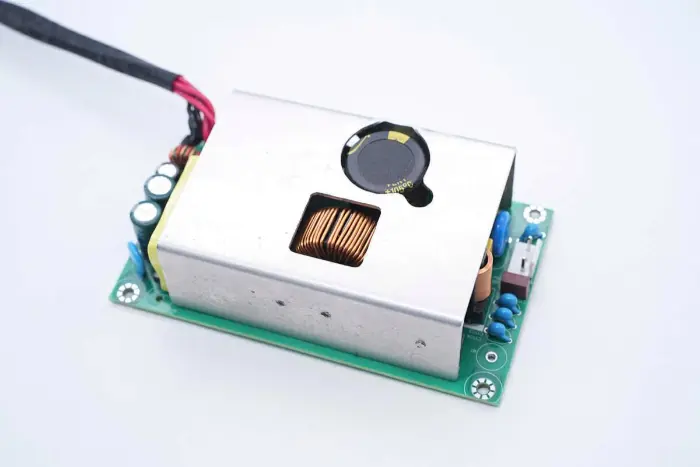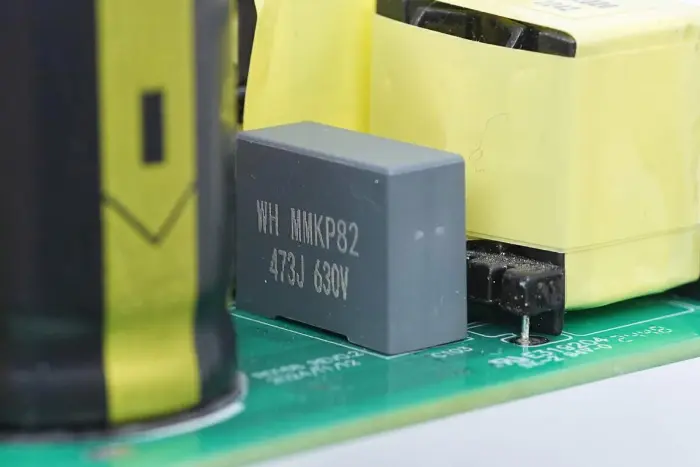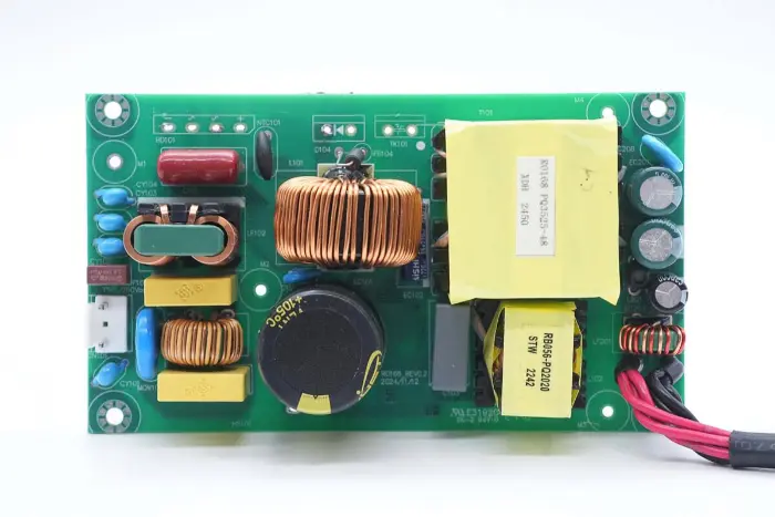 PCBA モジュールの前面の概要: 左側には、電源入力ソケット、ヒューズ、Y コンデンサ、バリスタ、コモンモード インダクタ、および安全 X2 コンデンサが装備されています。中間の位置には、PFC ブースト インダクタと高電圧フィルタ コンデンサが装備されています。右側にはLLC共振コンデンサ、共振インダクタ、トランス、フィルタコンデンサ、フィルタインダクタが搭載されています。
