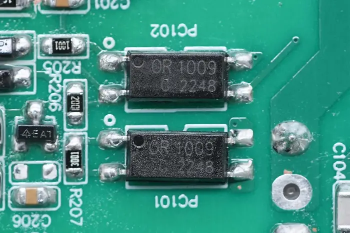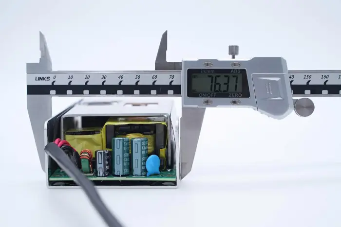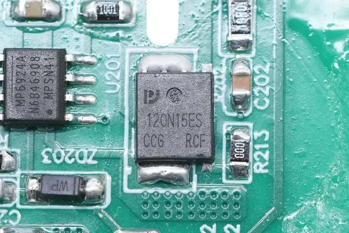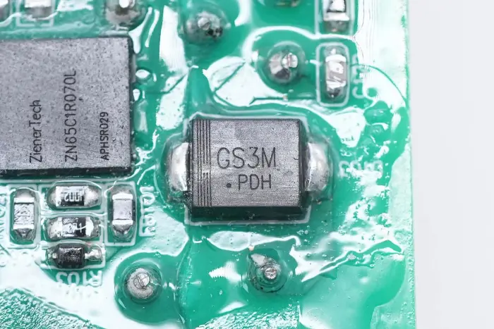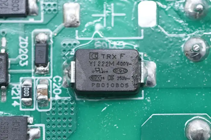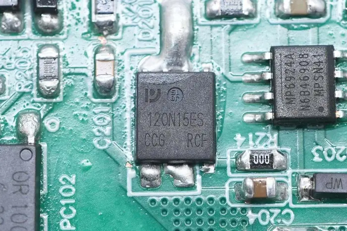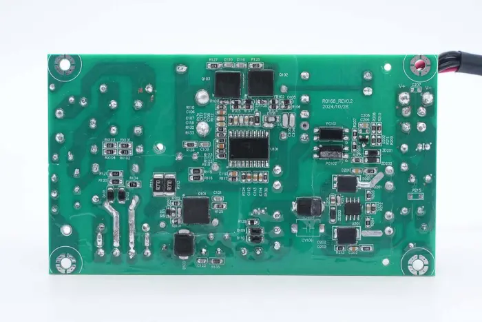 PCBA モジュールの背面には、2-in-1 PFC+LLC コントローラーがあります。 PFC スイッチは左下にあり、LLC スイッチはメイン制御チップの上にあり、フィードバック フォトカプラは右側にあり、同期整流器コントローラーと 2 つの同期整流器は下部にあります。基板全体は保護のためにコンフォーマルコーティングでコーティングされています。