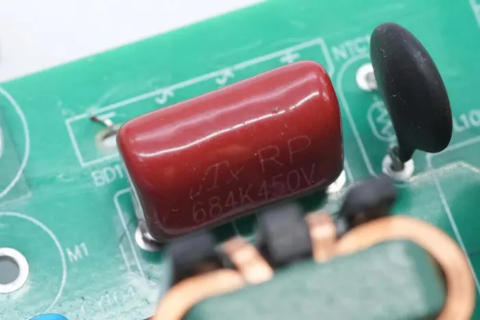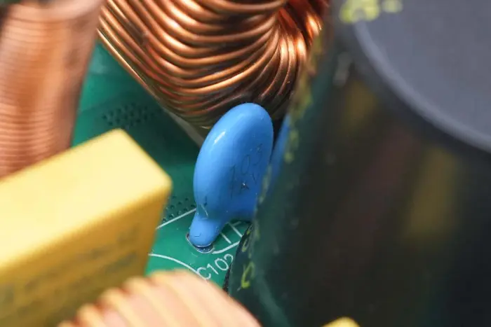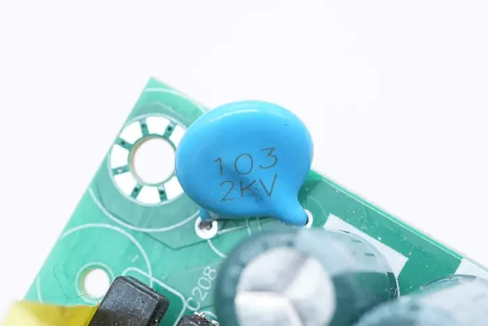 セラミックコンデンサは電解コンデンサと並列に接続されており、仕様は0.01μF 1KVです。