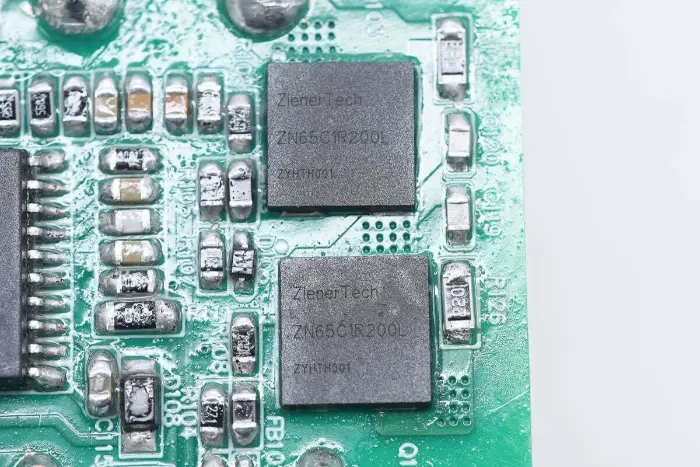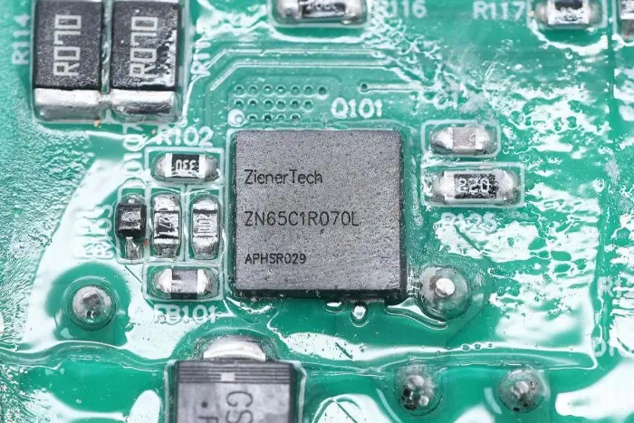 LLCスイッチはZenerTech製のモデルZN65C1R200Lで、耐電圧700V、過渡耐電圧800V、オン抵抗200mΩ、ゲート駆動電圧20V対応のカスコード構造GaNスイッチです。ゲート電荷が低いことが特徴で、駆動回路が効果的に簡素化されます。急速充電器、通信電源、データセンター、照明用途に適しており、DFN8*8にパッケージ化されています。