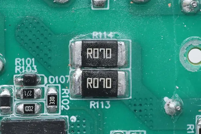 2 つの 70mΩ 抵抗が並列接続され、スイッチ電流を検出します。