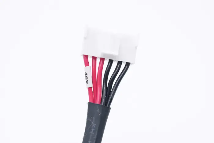 出力コネクタの拡大図: 赤いワイヤは正極で、スリーブには 48V 出力のマークが付いています。