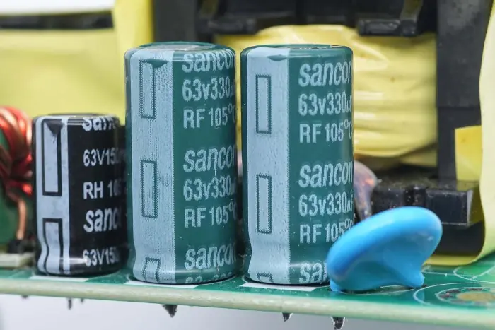 出力フィルタコンデンサは Sancon (Nantong Sanxin) 製の RF シリーズ長寿命コンデンサで、仕様は 63V 330μF、2 個並列です。