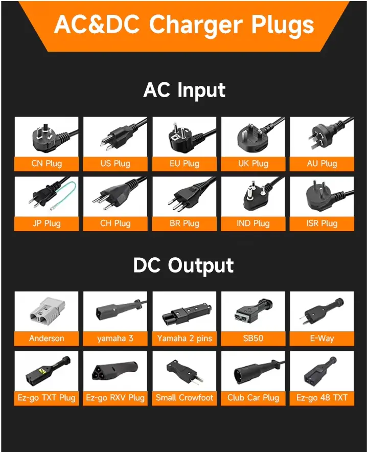 EU プラグは通常、ドイツ、フランス、オランダ、デンマーク、オーストリア、スウェーデンなどの EU 諸国向けです。 英国プラグ、通常は英国、インド、パキスタン、シンガポールなど用。 AUプラグ、通常オーストラリア、ニュージーランド、アルゼンチンなど用。 市場で一般的な DC コネクタには、Anderson、EZ-go、DS Club Car、ヤマハ コネクタなどが含まれます。