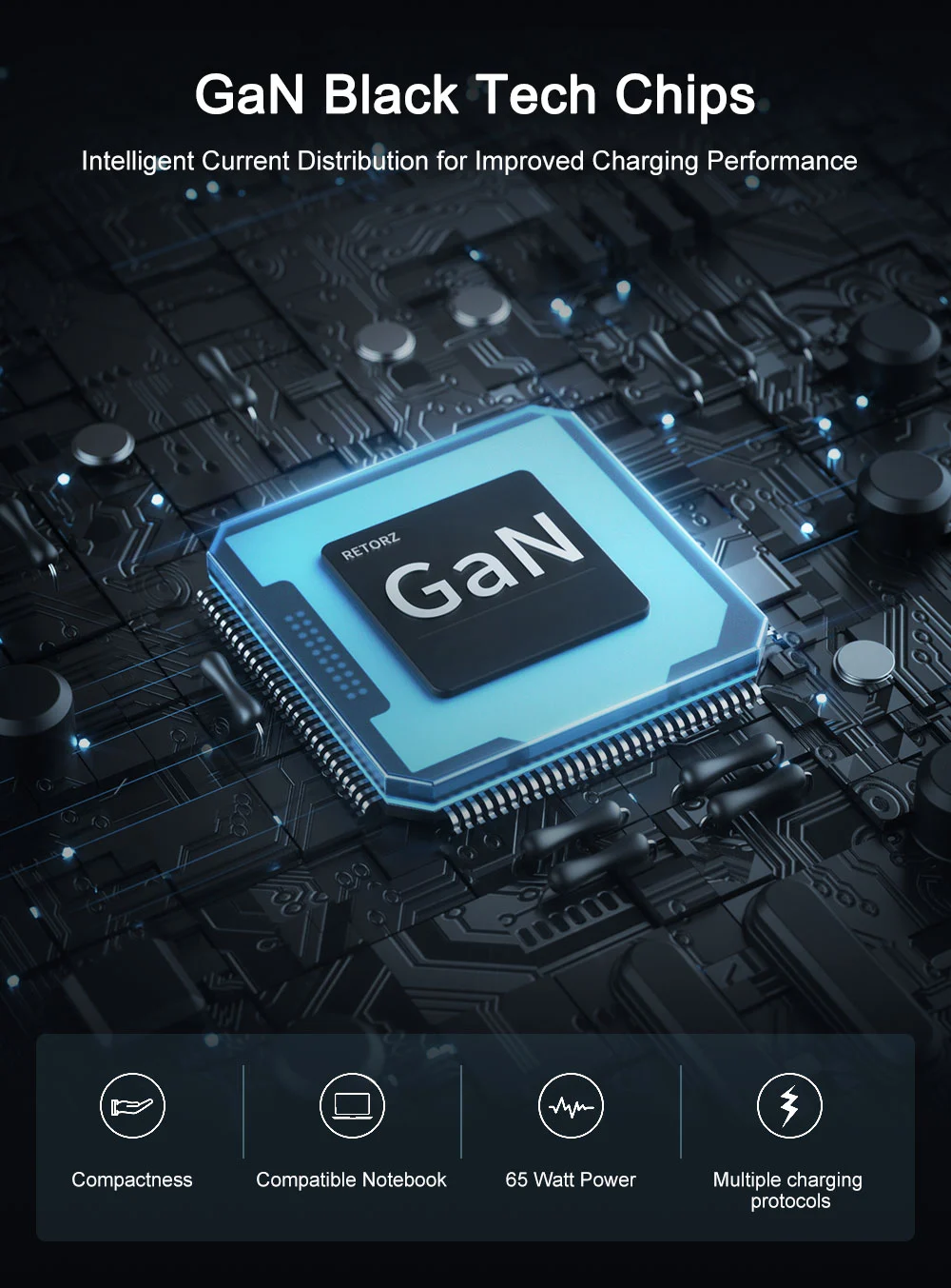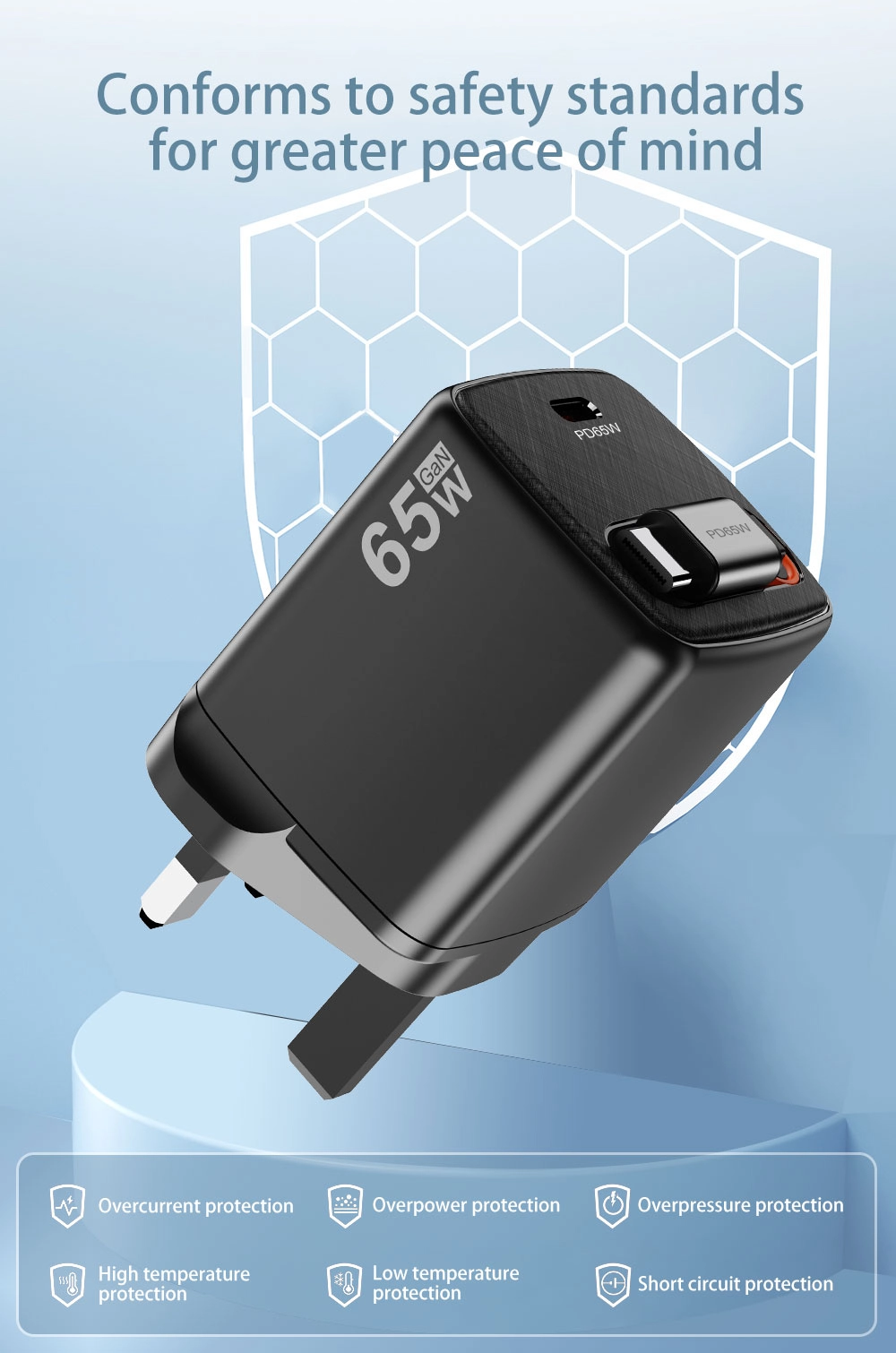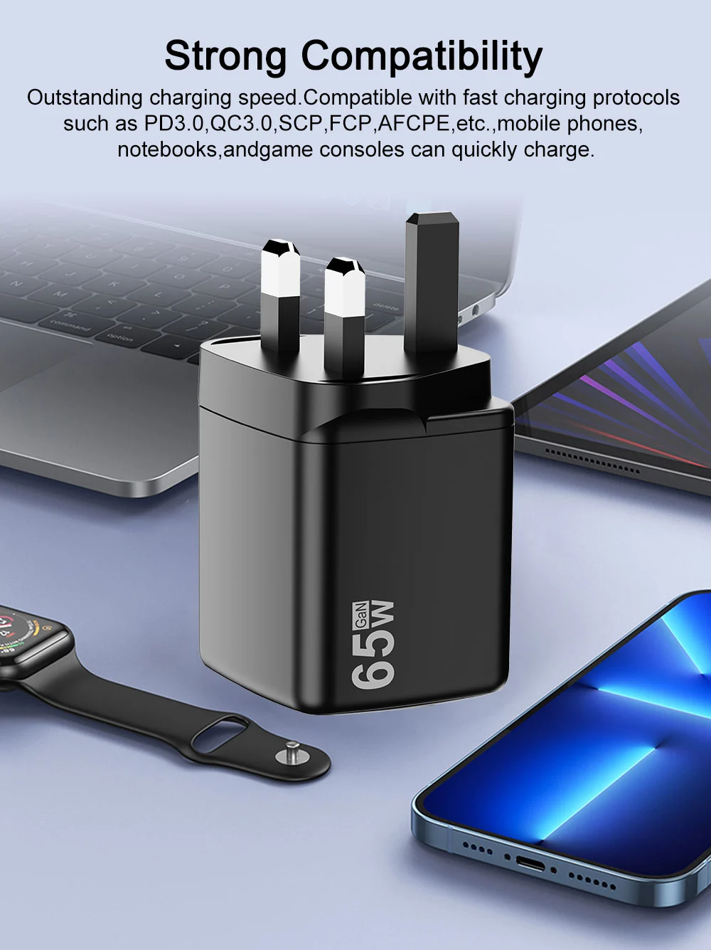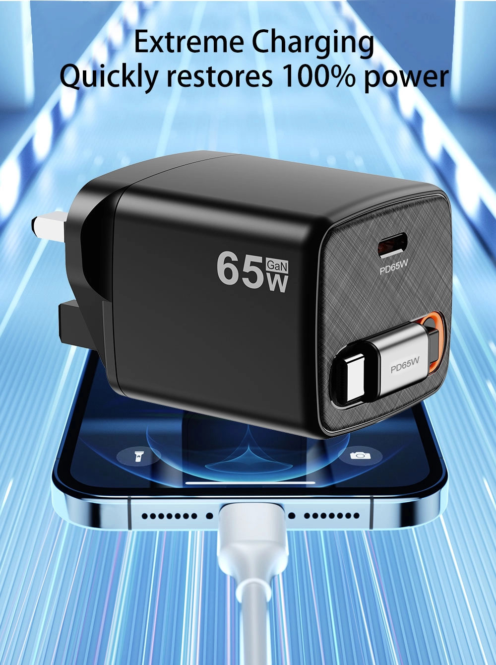 - 高速充電: 65W 出力により充電時間が短縮され、デバイスの電源がすぐに立ち上がります。